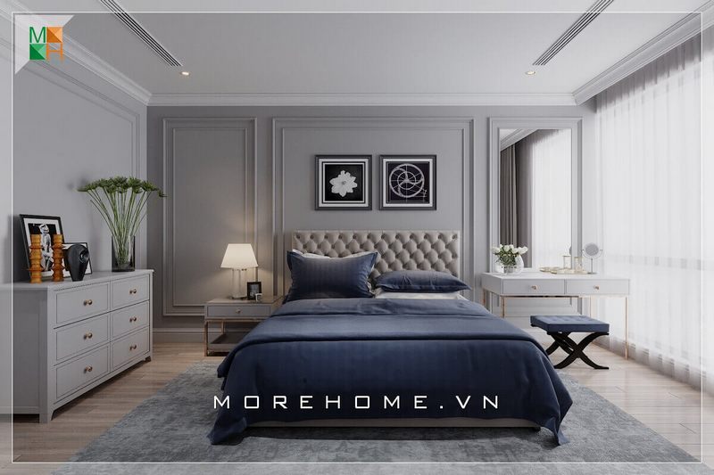 Nội thất phòng chung cư ngủ tân cổ điển thể hiện qua dáng giường, mẫu chăn ga, gối đệm, rèm buông đều mang phong cách cầu kỳ và chi tiết tỉ mỉ. Họa tiết trang trí chiếc giường được tối giản hóa nhưng vẫn hết sức lộng lẫy,ăn khớp với nội thất khác trong căn phòng ngủ mang lại 1 tổng thể hài hòa, thống nhất.
