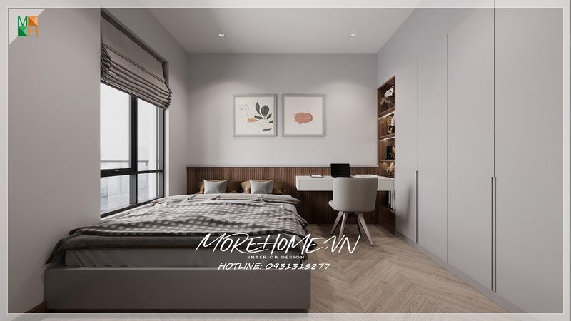 Sự kết hợp hài hòa giữa giường ngủ tân cổ điển bọc da khung gỗ, bàn làm việc đến tủ quần áo chung cư sử dùng chung chất liệu gỗ và màu sắc đông nhất giúp căn phòng ngủ trở nên sang trọng nhưng ấm cúng.