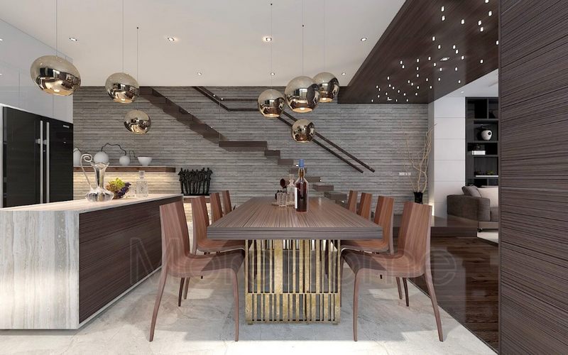 Thiết kế phòng ăn hiện đại với mẫu bàn ăn gỗ kết hợp mặt bàn đá sang trọng, ấm cúng