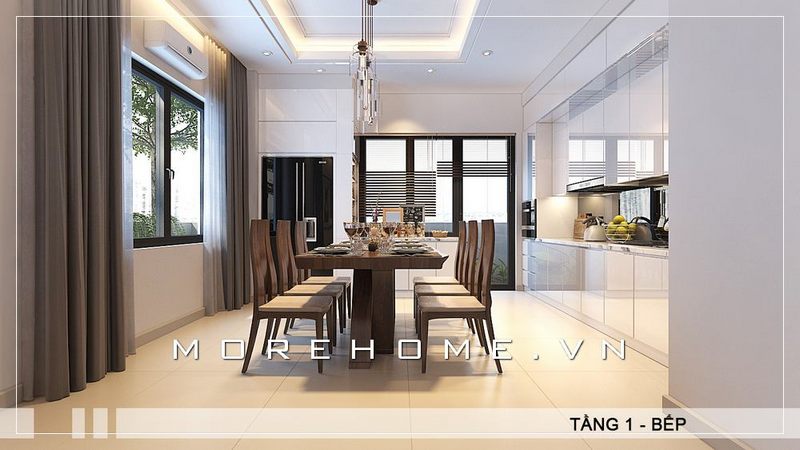 Mẫu thiết kế bàn ăn gỗ cao cấp màu nâu trầm có kích thước lớn kết hợp với mẫu ghế ăn tân cổ điển đẹp mang đến một không gian phòng ăn sang trọng, đẳng cấp cho căn biệt thự gia chủ
