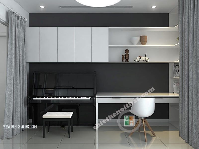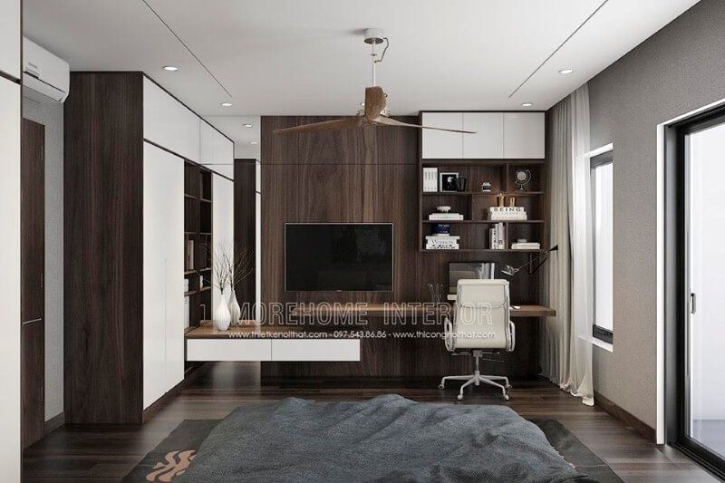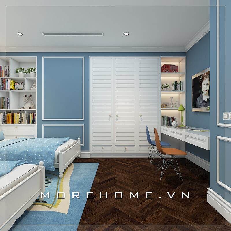 Góc học tập thiết kế liền kề phòng ngủ kết hợp với kệ sách gỗ công nghiệp đa năng và tiện nghi giúp không gian học tập của con