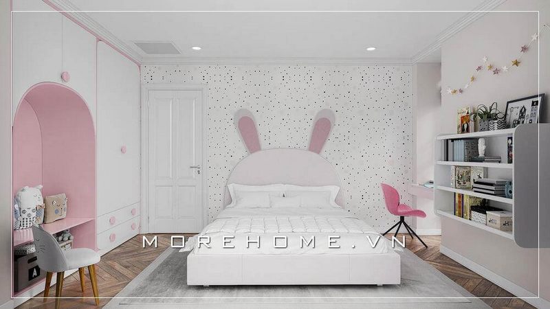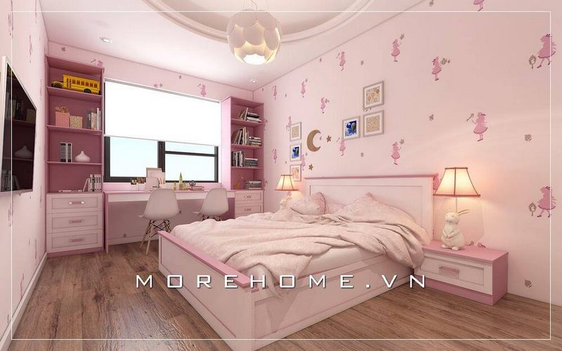 Mẫu bàn học gỗ công nghiệp sơn trắng hồng nhẹ nhàng tạo nên không gian hứng thú học tập cho con