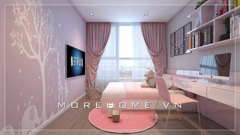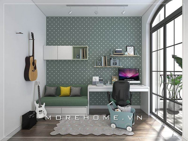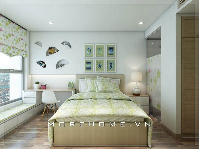 Bàn học của con được thiết kế ngay cạnh cửa sổ kèm giá sách treo phái tường, một không gian lý tưởng cho trí tưởng tượng bay cao, giúp bé có tư duy tốt hơn.