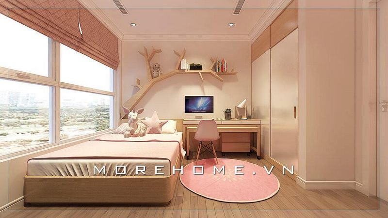 Bàn học của con được bố trí ngay sát cửa sổ kết hợp với kệ sách trang trí giúp con cảm thấy dễ chịu, tiện nghi và tập trung học tập hơn
