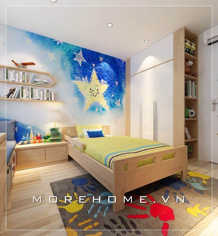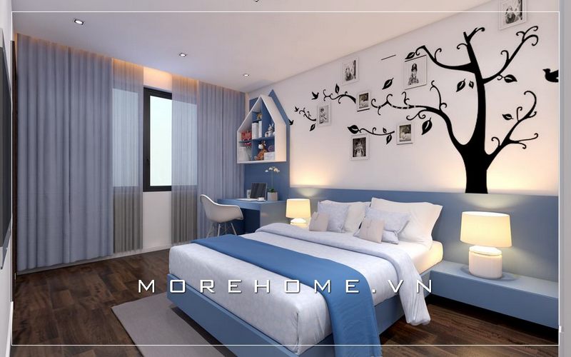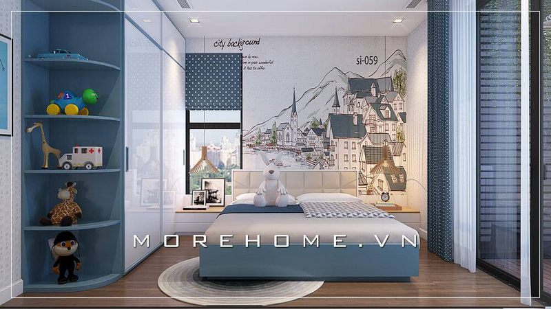Thiết kế phòng ngủ trẻ em hiện đại, chiếc giường ngủ gỗ hiện đại màu xanh tiện dụng tạo điểm nhấn cho cả căn phòng ngủ