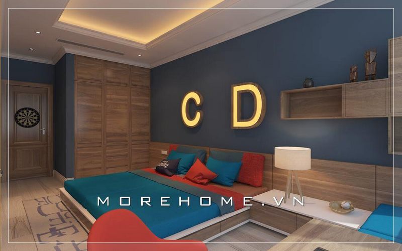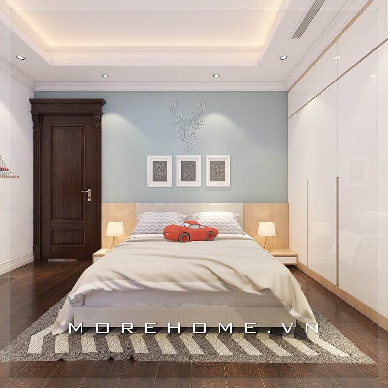 Giường ngủ bé trai hiện đại, tab đầu giường nối liền tạo sự tiện dụng cho không gian thêm ngăn nắp, gọn gàng