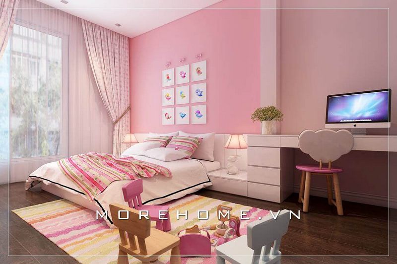 Giường ngủ bé gái được thiết kế với chân thanh mảnh, tông màu trắng nhẹ nhàng, tạo sự đồng điệu, cuốn hút cho cả không gian căn phòng