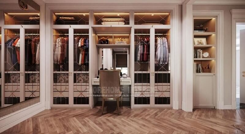 Không đơn thuần chỉ là một căn phòng để đồ đơn điệu của căn hộ chung cư, nhà phố, biệt thự mà nhà thiết kế rất sáng tạo khi thiết kế hai tủ đồ gỗ cánh kính hiện đại hai bên tường, vừa tận dụng được không gian mà còn thể hiện tính thẩm mỹ cao.