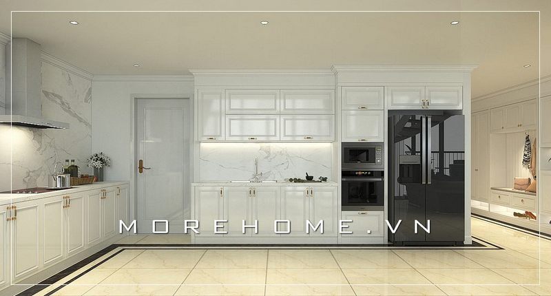 Mẫu tủ bếp đẹp gỗ tự nhiên thiết kế tân cổ điển màu trắng tạo điểm nhấn ấn tượng, sang trọng cho không gian phòng bếp biệt thự.