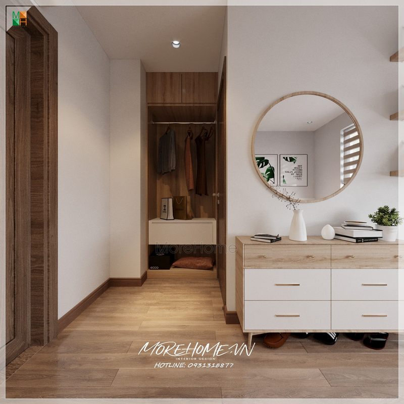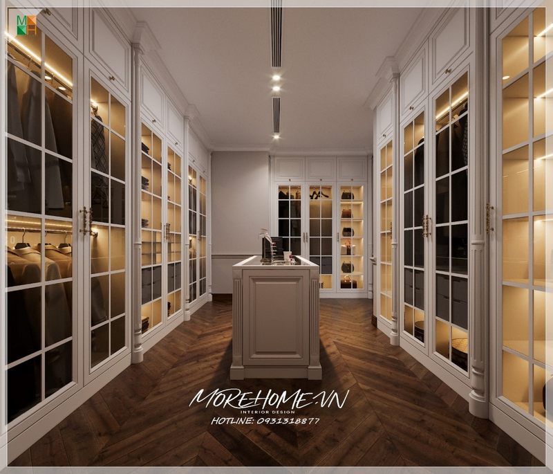 Hệ thống tủ quần áo phong cách đương đại kịch trần bằng gỗ tự nhiên sơn trắng kết hợp cánh kính sang trọng, mang đến sự hiện đại trẻ trung mà cao cấp cho không gian phòng thay đồ ** tag: thiết kế phòng thay đồ đương đại