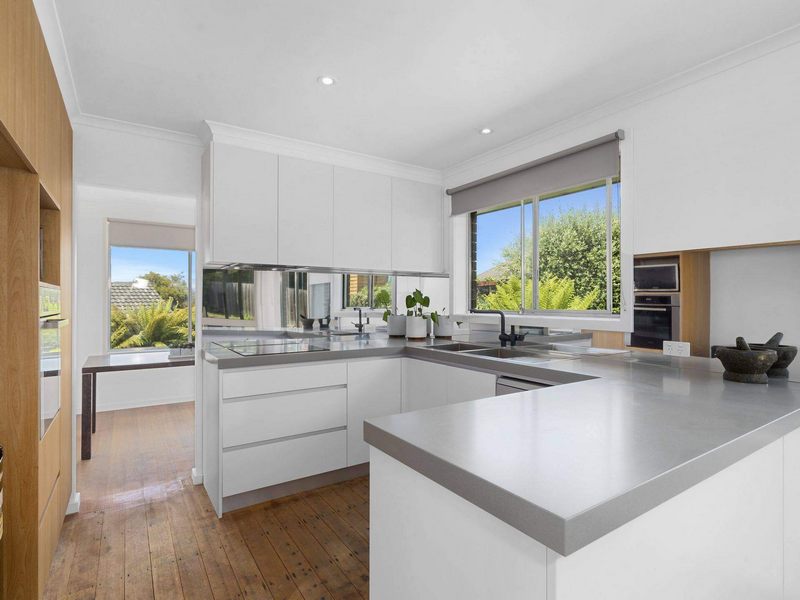Ốp bếp đá nhân tạo Hàn Quốc màu ghi làm nên một điểm nhấn hút mắt trong không gian bếp màu trắng.