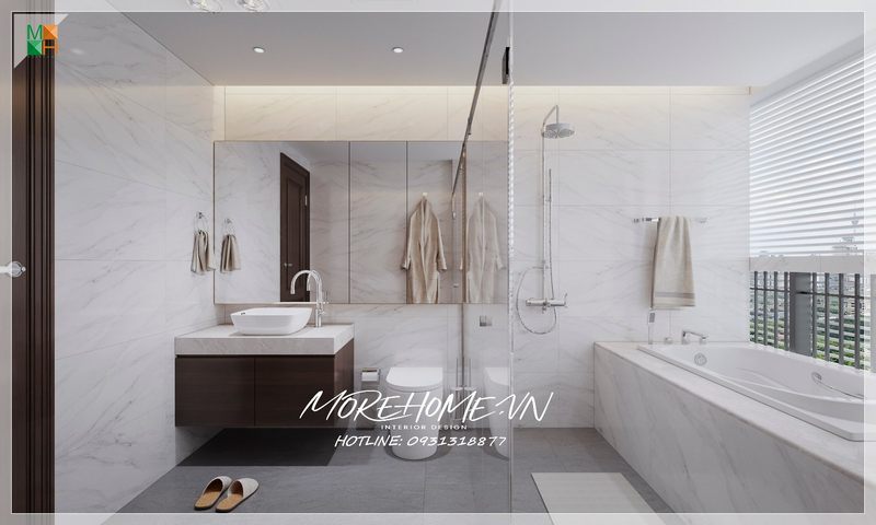 Với diện tích lớn, phòng tắm có thể được chia thành các khu vực bằng vách tắm bằng kính cường lực như khu vực tắm đứng, khu vực vệ sinh, khu vực tắm bồn và khu tủ lavabo. Điều này giúp ngăn nước và giữ sàn khô ráo, cũng như tạo ra một không gian liên kết trong phòng tắm.