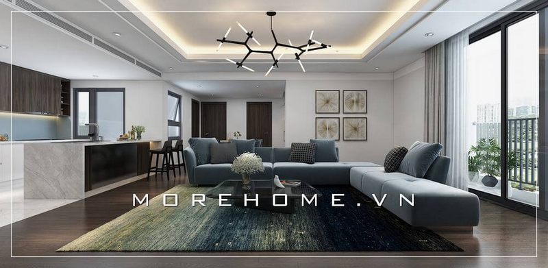 Bộ sofa phòng khách màu xanh ghi đánh dấu sự tỏa sáng trong không gian căn nhà.